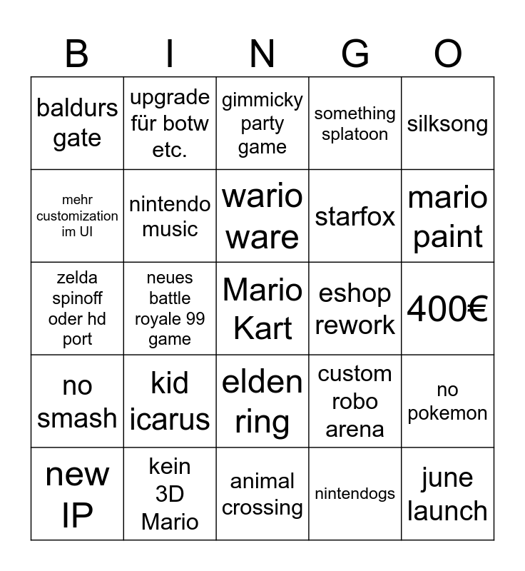 This bingo card has a free space and 24 words: kid icarus, kein 3D Mario, wario ware, new IP, silksong, baldurs gate, mehr customization im UI, upgrade für botw etc., eshop rework, elden ring, starfox, zelda spinoff oder hd port, custom robo arena, no pokemon, nintendo music, nintendogs, 400€, gimmicky party game, mario paint, neues battle royale 99 game, june launch, no smash, something splatoon and animal crossing.