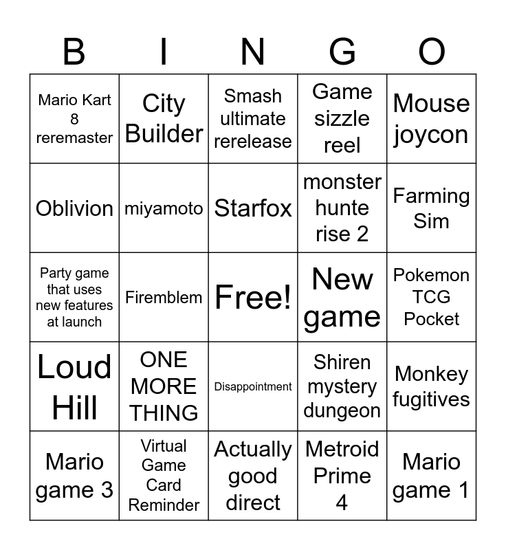 This bingo card has a free space and 44 words: Nintendo Today! app reminder, Mario game 1, Mario game 2, Mario game 3, Korby, Metroid Prime 4, Smash ultimate rerelease, Zelda TOTK, Mouse joycon, Virtual Game Card Reminder, Game sizzle reel, New game, Disappointment, ONE MORE THING, Pokemon ZA, Actually good direct, In person experiences reminder, Party game that uses new features at launch, "please, take a look", Farming Sim, City Builder, Dragon Quest 1&2 again, Mario Kart 9, Mario Kart 8 reremaster, Pokemon sleep, Pokemon TCG Pocket, Limbussy, Trauma Center con Giroscopio, Shiren mystery dungeon, Loud Hill, Silson, Monkey fugitives, Europa Universalis 6, F-Zero, Firemblem, Remakes 1, Remakes 2, New Smash, Starfox, Oblivion, monster hunte rise 2, doug bowser, miyamoto and price reveal.