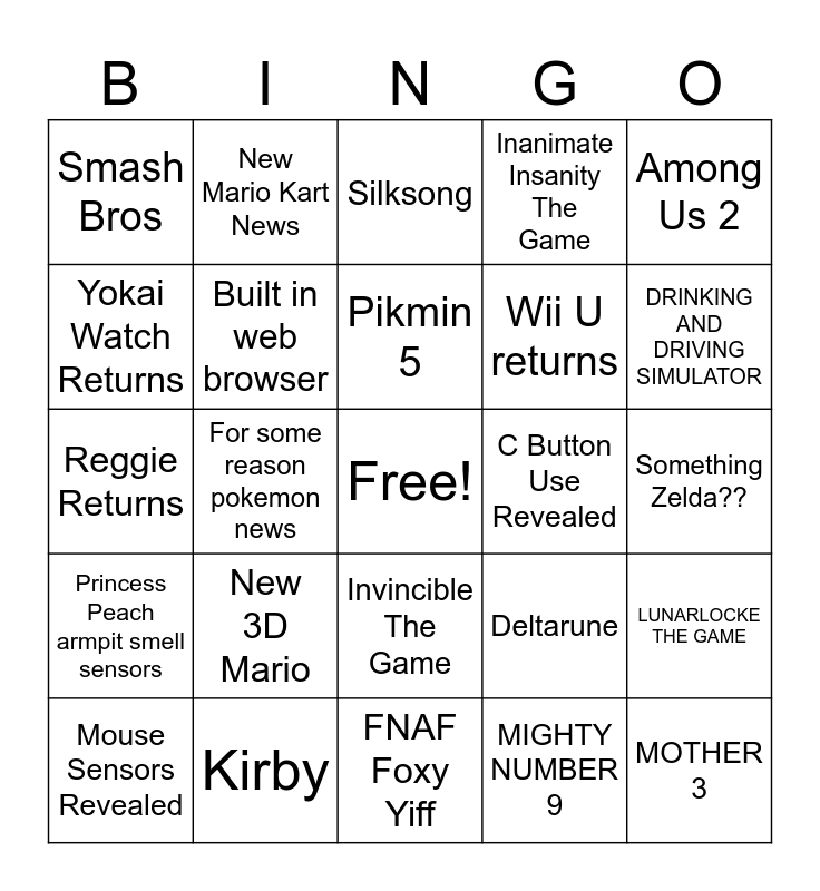 This bingo card has a free space and 24 words: New 3D Mario, Kirby, Pikmin 5, Mouse Sensors Revealed, Among Us 2, Smash Bros, Yokai Watch Returns, New Mario Kart News, C Button Use Revealed, Invincible The Game, Wii U returns, Reggie Returns, Deltarune, LUNARLOCKE THE GAME, Built in web browser, MIGHTY NUMBER 9, Something Zelda??, Silksong, DRINKING AND DRIVING SIMULATOR, For some reason pokemon news, MOTHER 3, Princess Peach armpit smell sensors, Inanimate Insanity The Game and FNAF Foxy Yiff.