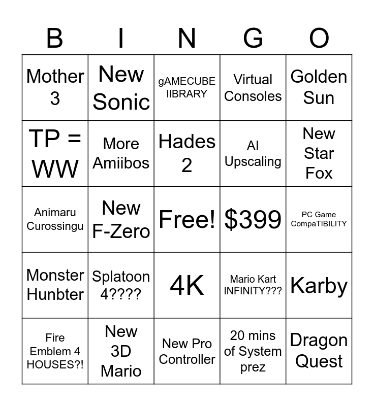 This bingo card has a free space and 24 words: Splatoon 4????, New 3D Mario, Hades 2, Fire Emblem 4 HOUSES?!, Golden Sun, Mother 3, TP = WW, New Sonic, $399, 4K, AI Upscaling, Animaru Curossingu, Mario Kart INFINITY???, Karby, More Amiibos, 20 mins of System prez, PC Game CompaTIBILITY, gAMECUBE lIBRARY, New Star Fox, New F-Zero, Dragon Quest, Monster Hunbter, Virtual Consoles and New Pro Controller.