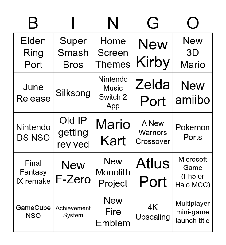 This bingo card has a free space and 24 words: New F-Zero, Achievement System, Nintendo Music Switch 2 App, GameCube NSO, New 3D Mario, Elden Ring Port, June Release, Super Smash Bros, A New Warriors Crossover, New Monolith Project, Zelda Port, Nintendo DS NSO, Atlus Port, Microsoft Game (Fh5 or Halo MCC), Silksong, 4K Upscaling, Pokemon Ports, Home Screen Themes, New amiibo, Old IP getting revived, Multiplayer mini-game launch title, Final Fantasy IX remake, New Kirby and New Fire Emblem.