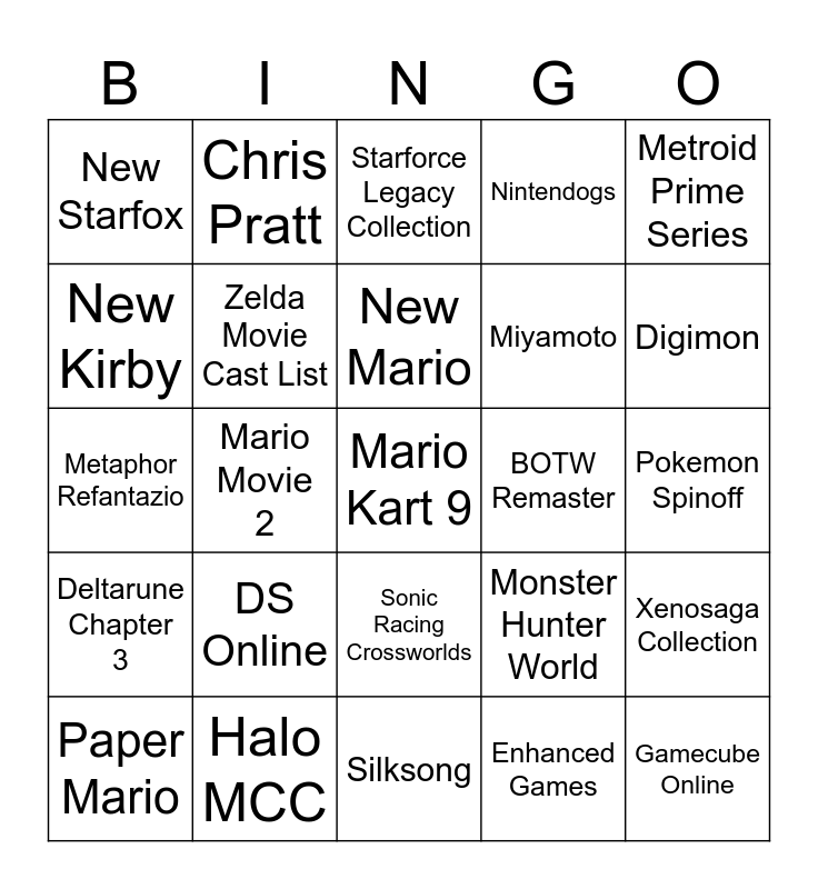 This bingo card has a free space and 24 words: DS Online, Halo MCC, New Mario, Paper Mario, Metroid Prime Series, New Starfox, New Kirby, Chris Pratt, BOTW Remaster, Sonic Racing Crossworlds, Miyamoto, Metaphor Refantazio, Monster Hunter World, Xenosaga Collection, Zelda Movie Cast List, Enhanced Games, Pokemon Spinoff, Starforce Legacy Collection, Digimon, Mario Movie 2, Gamecube Online, Deltarune Chapter 3, Nintendogs and Silksong.