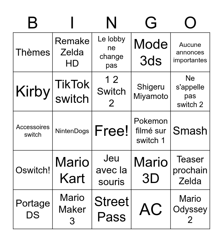 This bingo card has a free space and 24 words: Mario Kart, Mario Maker 3, 1 2 Switch 2, Portage DS, Aucune annonces importantes, Thèmes, Kirby, Remake Zelda HD, Pokemon filmé sur switch 1, Jeu avec la souris, Shigeru Miyamoto, Accessoires switch, Mario 3D, Teaser prochain Zelda, TikTok switch, AC, Smash, Le lobby ne change pas, Ne s'appelle pas switch 2, NintenDogs, Mario Odyssey 2, Oswitch!, Mode 3ds and Street Pass.