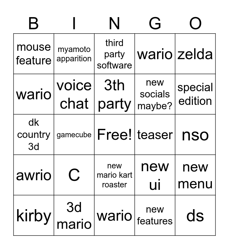 This bingo card has a free space and 24 words: C, 3d mario, 3th party, kirby, zelda, mouse feature, wario, myamoto apparition, teaser, new mario kart roaster, new socials maybe?, dk country 3d, new ui, new menu, voice chat, new features, nso, third party software, special edition, gamecube, ds, awrio, wario and wario.