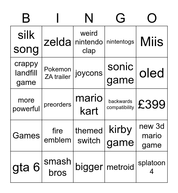 This bingo card has a free space and 24 words: fire emblem, smash bros, joycons, gta 6, Miis, silk song, crappy landfill game, zelda, backwards compatibility, themed switch, sonic game, more powerful, kirby game, new 3d mario game, Pokemon ZA trailer, metroid, £399, weird nintendo clap, oled, preorders, splatoon 4, Games, nintentogs and bigger.