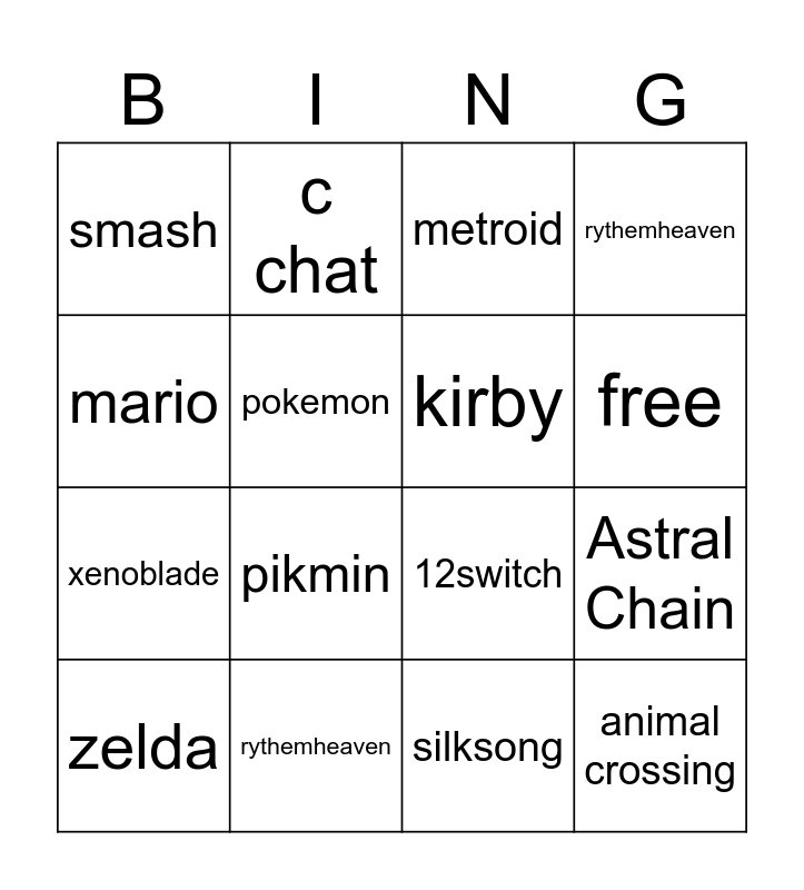This bingo card has 18 words: pikmin, animal crossing, metroid, smash, 12switch, rythemheaven, zelda, c chat, free, xenoblade, silksong, mario, Astral Chain, pokemon, kirby, luigi, rythemheaven and splatoon.