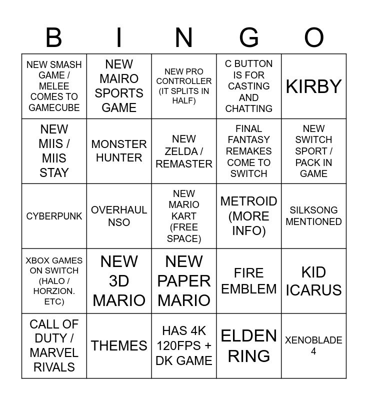 This bingo card has a free space and 24 words: NEW 3D MARIO, THEMES, NEW ZELDA / REMASTER, CALL OF DUTY / MARVEL RIVALS, KIRBY, NEW SMASH GAME / MELEE COMES TO GAMECUBE, NEW MIIS / MIIS STAY, NEW MAIRO SPORTS GAME, METROID (MORE INFO), NEW PAPER MARIO, FINAL FANTASY REMAKES COME TO SWITCH, CYBERPUNK, FIRE EMBLEM, KID ICARUS, MONSTER HUNTER, ELDEN RING, SILKSONG MENTIONED, NEW PRO CONTROLLER (IT SPLITS IN HALF), NEW SWITCH SPORT / PACK IN GAME, OVERHAUL NSO, XENOBLADE 4, XBOX GAMES ON SWITCH (HALO / HORZION. ETC), C BUTTON IS FOR CASTING AND CHATTING and HAS 4K 120FPS + DK GAME.