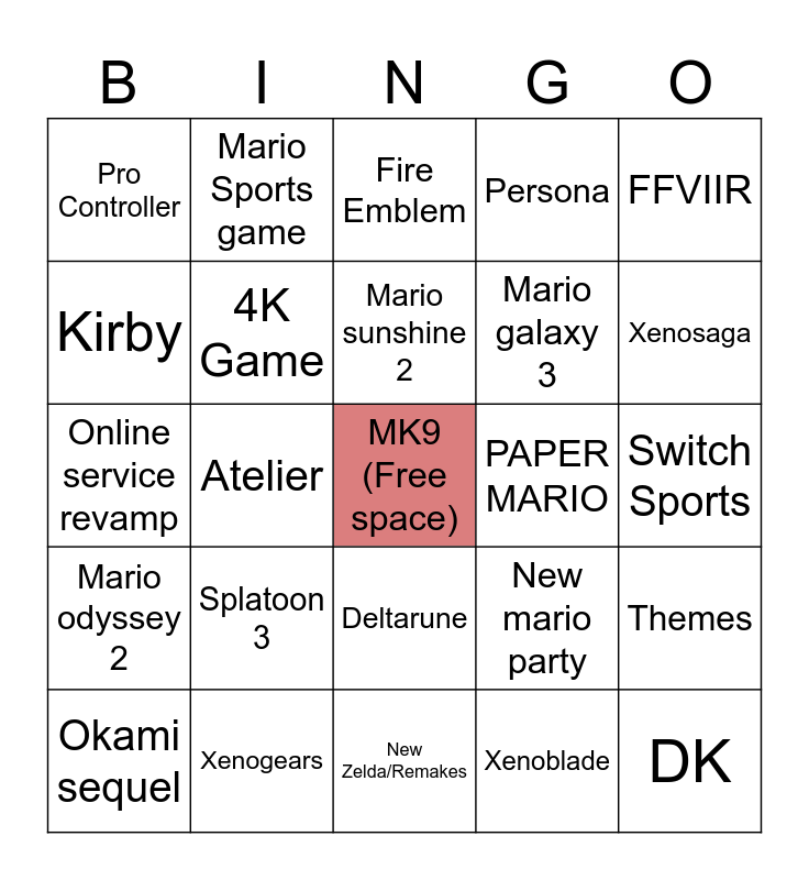 This bingo card has a free space and 24 words: Splatoon 3, Xenogears, Mario sunshine 2, Okami sequel, FFVIIR, Pro Controller, Kirby, Mario Sports game, PAPER MARIO, Deltarune, Mario galaxy 3, Online service revamp, New mario party, Themes, 4K Game, Xenoblade, Switch Sports, Fire Emblem, Xenosaga, Atelier, DK, Mario odyssey 2, Persona and New Zelda/Remakes.