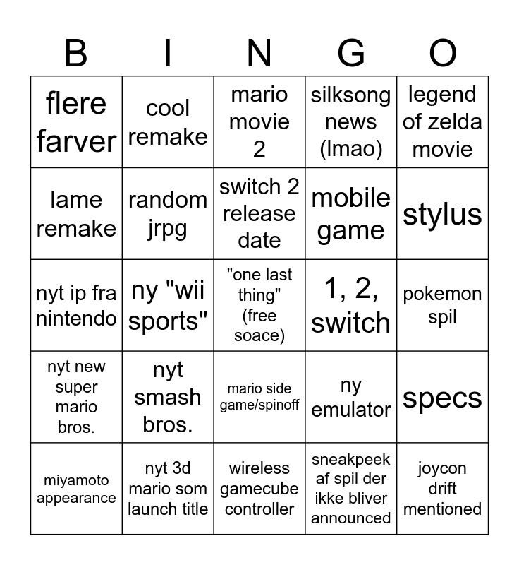 This bingo card has a free space and 24 words: nyt smash bros., nyt 3d mario som launch title, switch 2 release date, miyamoto appearance, legend of zelda movie, flere farver, lame remake, cool remake, 1, 2, switch, mario side game/spinoff, mobile game, nyt ip fra nintendo, ny emulator, specs, random jrpg, sneakpeek af spil der ikke bliver announced, pokemon spil, mario movie 2, stylus, ny "wii sports", joycon drift mentioned, nyt new super mario bros., silksong news (lmao) and wireless gamecube controller.