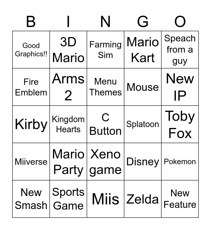 This bingo card has a free space and 24 words: Mario Party, Sports Game, Menu Themes, New Smash, Speach from a guy, Good Graphics!!, Fire Emblem, 3D Mario, Splatoon, Xeno game, Mouse, Kirby, Disney, Pokemon, Arms 2, Zelda, Toby Fox, Farming Sim, New IP, Kingdom Hearts, New Feature, Miiverse, Mario Kart and Miis.