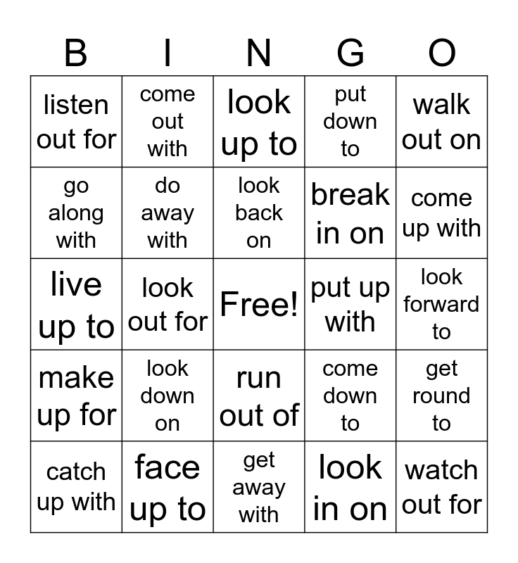 This bingo card has a free space and 29 words: catch up with, get on with, look out for, come up against, listen out for, look up to, do away with, look down on, put up with, face up to, look forward to, watch out for, get away with, look in on, come up with, keep up with, run out of, make up for, walk out on, live up to, come down to, go through with, break in on, go along with, put down to, come out with, get round to, look back on and stand up to.