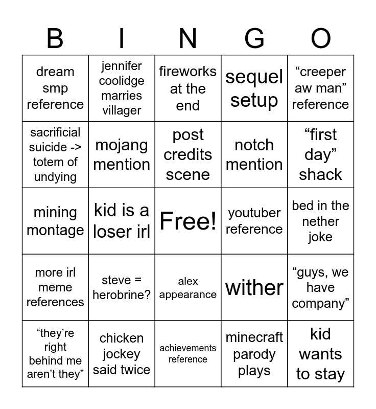This bingo card has a free space and 24 words: steve = herobrine?, chicken jockey said twice, post credits scene, “they’re right behind me aren’t they”, “creeper aw man” reference, dream smp reference, sacrificial suicide -> totem of undying, jennifer coolidge marries villager, youtuber reference, alex appearance, notch mention, mining montage, wither, “guys, we have company”, mojang mention, minecraft parody plays, bed in the nether joke, fireworks at the end, “first day” shack, kid is a loser irl, kid wants to stay, more irl meme references, sequel setup and achievements reference.