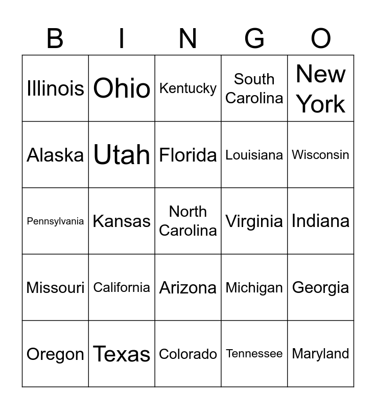 This bingo card has a free space and 24 words: California, Texas, Florida, Oregon, New York, Illinois, Alaska, Ohio, Virginia, Arizona, Louisiana, Pennsylvania, Michigan, Georgia, Utah, Tennessee, Indiana, Kentucky, Wisconsin, Kansas, Maryland, Missouri, South Carolina and Colorado.