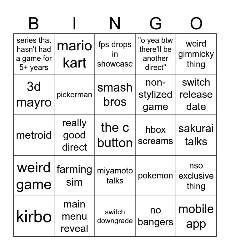 This bingo card has a free space and 24 words: farming sim, main menu reveal, smash bros, kirbo, weird gimmicky thing, series that hasn't had a game for 5+ years, 3d mayro, mario kart, hbox screams, miyamoto talks, non-stylized game, metroid, pokemon, nso exclusive thing, pickerman, no bangers, sakurai talks, fps drops in showcase, switch release date, really good direct, mobile app, weird game, "o yea btw there'll be another direct" and switch downgrade.
