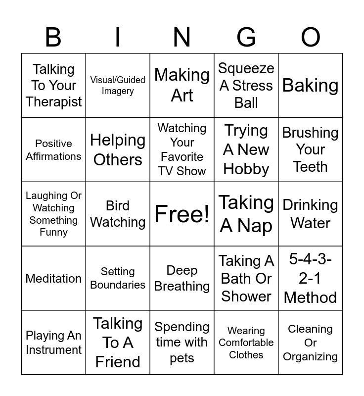 This bingo card has a free space and 49 words: Taking Breaks From Screens, Cleaning Or Organizing, Prayer/Spiritual Practices, Spending time with pets, Setting Boundaries, Saying "No" when needed, Visual/Guided Imagery, Smelling Calming Scents/Aromatherapy, Positive Affirmations, Volunteering In Your Community, Helping Others, Squeeze A Stress Ball, 5-4-3-2-1 Method, Taking A Bath Or Shower, Writing Poetry, Coloring, Watching Your Favorite TV Show, Taking A Nap, Knitting or Sewing, Baking, Bird Watching, Wearing Comfortable Clothes, Talking To Your Therapist, Trying A New Hobby, Sitting In The Sun, Brushing Your Teeth, Playing An Instrument, Playing Sudoku/Wordsearch, Deep Breathing, Meditation, Exercise, Walking In Nature, Journaling, Listening To Music, Talking To A Friend, Therapy, Counseling, Practicing Gratitude, Drinking Water, Eating Nutritious Foods, Limiting Caffeine, Avoiding Alcohol and Drugs, Getting Enough Sleep, Reading A Book, Laughing Or Watching Something Funny, Making Art, Practicing Mindfulness, Yoga and Stretching.