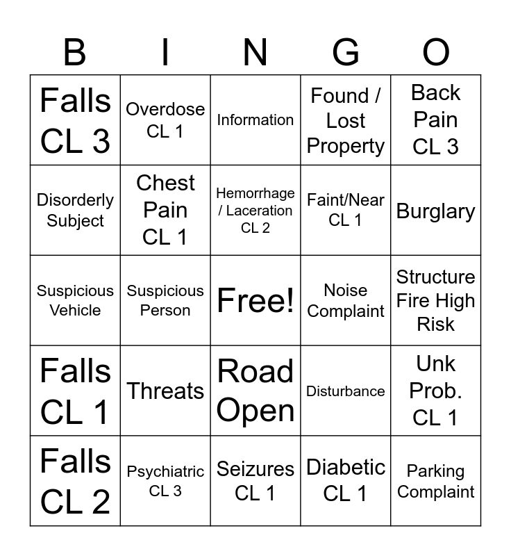 This bingo card has a free space and 84 words: 911 Hang Up, Phone Call, Information, Domestic, Alarms Police, MVA no Injury, Sick Person CL 3, Breathing Problem CL 1, Control Burn, Check Welfare, Animal Complaint, Sick Person CL 1, Chest Pain CL 1, Noise Complaint, Theft, Falls CL 3, Falls CL 2, Disorderly Subject, Fire Alarm, Erratic Driver, Road Conditions, Faint/Near CL 1, Parking Complaint, Hit & Run, Suspicious Person, Unk Prob. PD Only, Motorist Assist, Harassment, Traffic Violation / Complaint, Mischief, Threats, Fraud / Forgery, Tresspassing, Suspicious Vehicle, Missing / Runaway, MVA Unk. Injuries, Seizures CL 1, Unk Prob. CL 3, Burglary, Falls CL 1, Psychiatric CL 2, Stroke / CVA CL 1, Shots Fired, Veh. Repo / Impound, MVA w/ Inj. CL 2, Vehicle Theft, Overdose CL 1, Heart Prob. CL 1, Assault No EMS, Cardiac Arrest CL 1, Fight, Disturbance, Found / Lost Property, Abd. Pain CL 3, Wires Down, Hemorrhage / Laceration CL 1, Psychiatric CL 3, Hemorrhage / Laceration CL 2, Structure Fire Residential, Structure Fire High Risk, Drug Violation, Abd. Pain CL 1, Psychiatric CL 1, Child Custody, Wanted Person, Abandoned Vehicle, Unk Prob. CL 2, Faint / Near CL 3, Back Pain CL 3, MVA Report, Unk Prob. CL 1, CO Detector, Retail Theft, Road Closed, Road Open, Diabetic CL 1, MVA w/Inj. CL 1, Gas Leak Inside, Gas Leak Outside, Vehicle Fire, Brush Fire, Public Service, MVA w/FD and Investigation Inside.