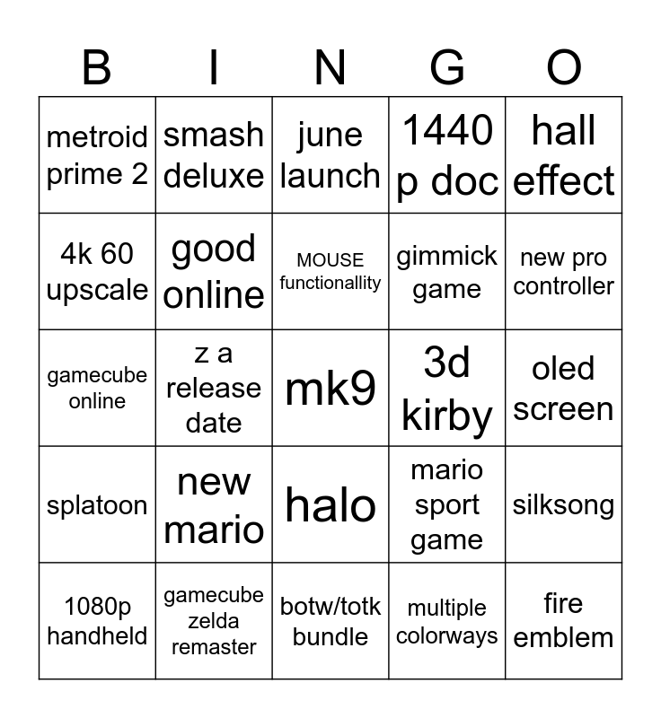 This bingo card has a free space and 24 words: new mario, gamecube zelda remaster, MOUSE functionallity, 1080p handheld, hall effect, metroid prime 2, 4k 60 upscale, smash deluxe, 3d kirby, halo, gimmick game, gamecube online, mario sport game, silksong, good online, multiple colorways, oled screen, june launch, new pro controller, z a release date, fire emblem, splatoon, 1440 p doc and botw/totk bundle.