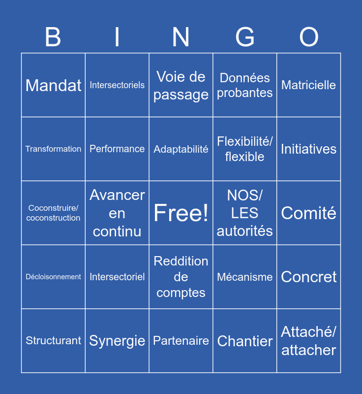 This bingo card has a free space and 45 words: Arrimage/ arrimer, Attaché/ attacher, Novateur, Structurant, "Tour de roue", Chantier, Voie de passage, Agile/ agilité, Matricielle, Synergie, Données probantes, NOS/ LES autorités, Reddition de comptes, Intersectoriel, Tranvsersal, Partenaire, Indicateurs, Coconstruire/ coconstruction, Paradigme, Initiatives, Intersectoriels, Changement, Soutenant, Mandat, Priorisation, Comité, Collaboration, Structure de gouvernance, Mécanisme, Décloisonnement, Travailler en silo, Concret, Mailler/ maillage, Processus, Meilleures pratiques, Avancer en continu, Sentiment d'uniformité, Réinventer la roue, Nouvelle posture, Adaptabilité, Transformation, Flexibilité/ flexible, Souplesse/ souple, Performance and Tableau de bord.