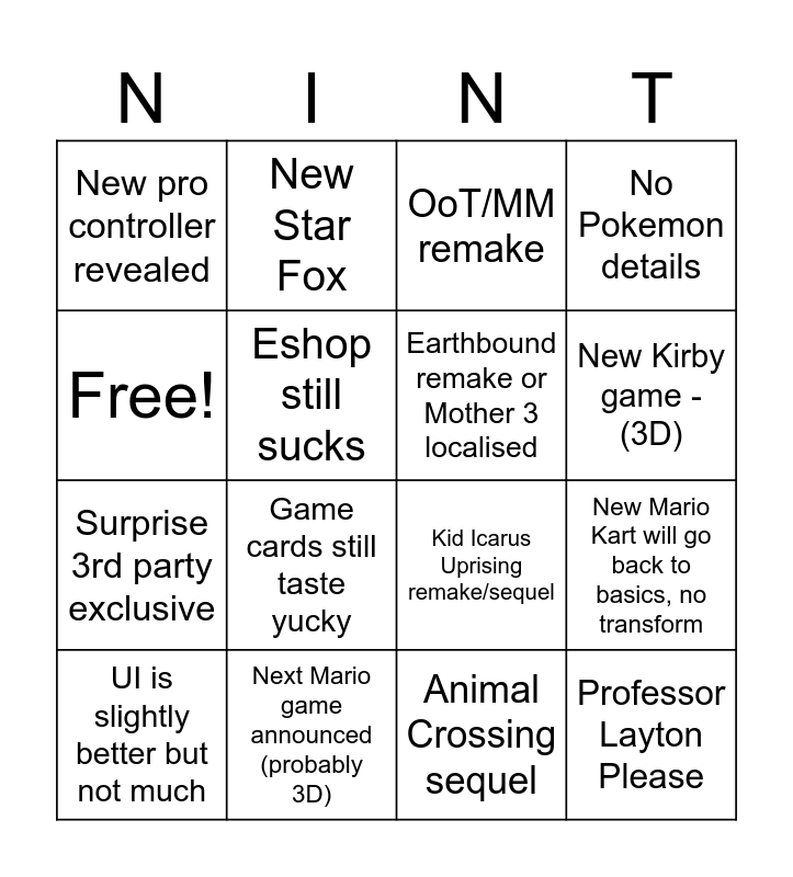 This bingo card has 16 words: Next Mario game announced (probably 3D), New Mario Kart will go back to basics, no transform, OoT/MM remake, New pro controller revealed, Surprise 3rd party exclusive, New Star Fox, Kid Icarus Uprising remake/sequel, Animal Crossing sequel, Free!, Eshop still sucks, UI is slightly better but not much, No Pokemon details, Game cards still taste yucky, New Kirby game - (3D), Earthbound remake or Mother 3 localised and Professor Layton Please.