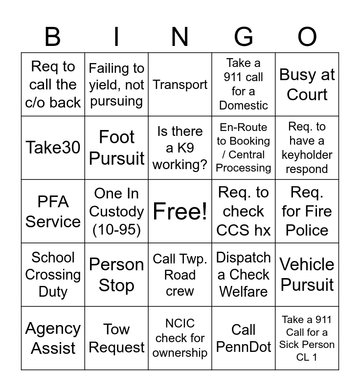 This bingo card has a free space and 38 words: Traffic Stop, Warrant Service, PC, Foot Pursuit, Vehicle Pursuit, Person Stop, Is there a K9 working?, Walk in at Sig 2, Busy at Court, En-Route to Booking / Central Processing, One In Custody (10-95), Take a 911 call for a Domestic, Take a 911 Call for a Sick Person CL 1, Req. for Fire Police, Take30, School Crossing Duty, Dispatch an Alarms Police, Transport, Dispatch MVA no Injury, Req. to check CCS hx, Req to call the c/o back, Tow Request, Req. to have a keyholder respond, Agency Assist, NCIC check for wanted, NCIC check for ownership, Send another unit non-emergency, FST, Flagged Down, Building Check, Call the dog officer, Call Twp. Road crew, Call PennDot, Failing to yield, not pursuing, Dispatch a 911 Hang Up, Dispatch a Check Welfare, PFA Service and Vacation Check.
