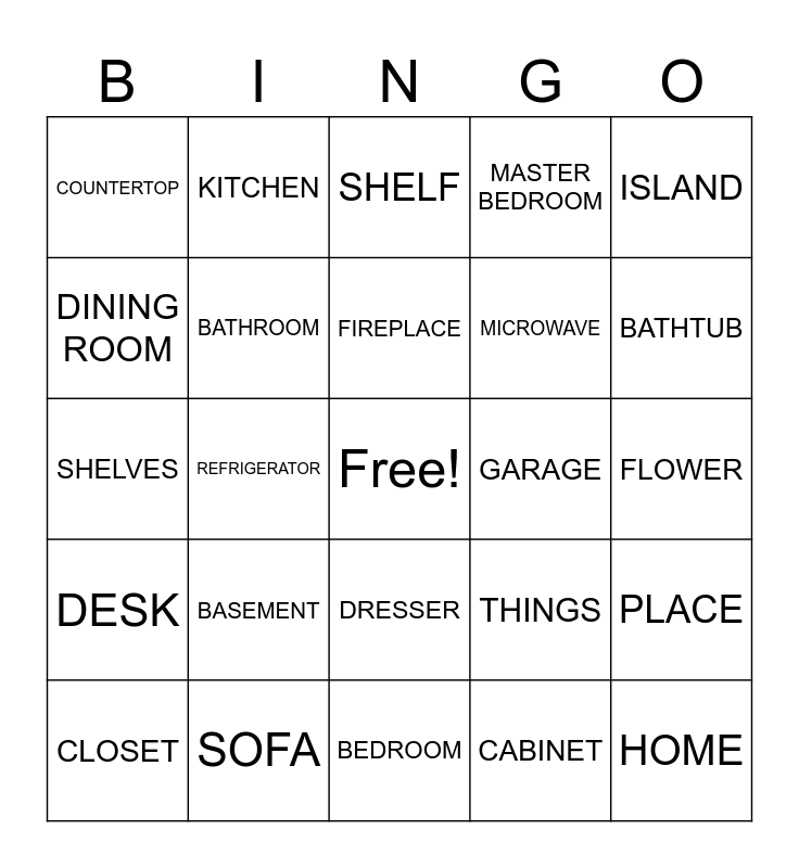 This bingo card has a free space and 47 words: HOUSE, HOME, ROOM, BEDROOM, BASEMENT, ATTIC, KITCHEN, LIVING ROOM, DINING ROOM, LAUNDRY ROOM, BATHROOM, MASTER BEDROOM, PLACE, THINGS, WINDOW, HALLWAY, FIREPLACE, GARAGE, ROOF, ISLAND, REFRIGERATOR, CABINET, COUNTERTOP, MICROWAVE, SINK, BATHTUB, CLOSET, RUG, DRESSER, DESK, BED, PILLOW, SHOWER, WALL, ENTER/GO-IN, SOFA, FLOWER, CHAIR, CURTAINS, TABLE, BLINDS, SHELF, SHELVES, LAMP, LIGHT, TV and MIRROR.