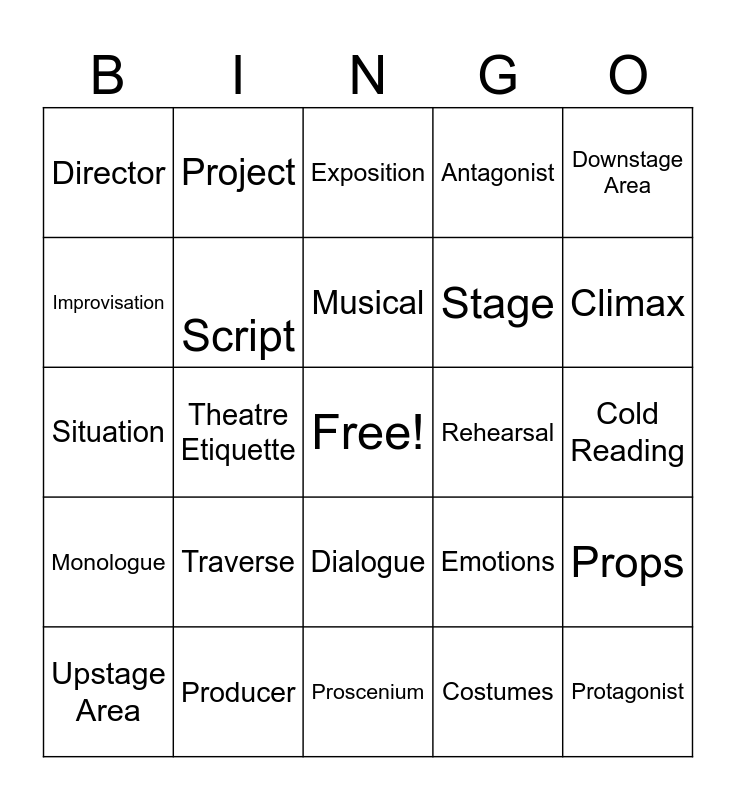 This bingo card has a free space and 24 words: Traverse, Producer, Musical, Upstage Area, Downstage Area, Director, Improvisation, Project, Rehearsal, Dialogue, Stage, Situation, Emotions, Props, Script, Costumes, Cold Reading, Exposition, Climax, Theatre Etiquette, Protagonist, Monologue, Antagonist and Proscenium.