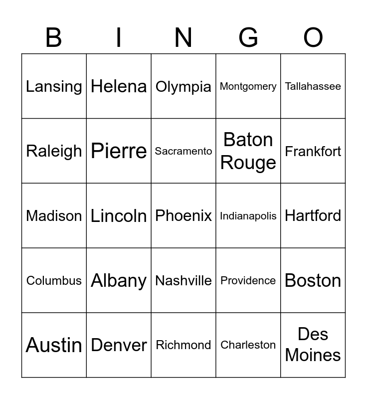 This bingo card has a free space and 24 words: Albany, Denver, Sacramento, Austin, Tallahassee, Lansing, Raleigh, Helena, Indianapolis, Nashville, Baton Rouge, Madison, Providence, Boston, Pierre, Charleston, Hartford, Olympia, Frankfort, Lincoln, Des Moines, Columbus, Montgomery and Richmond.