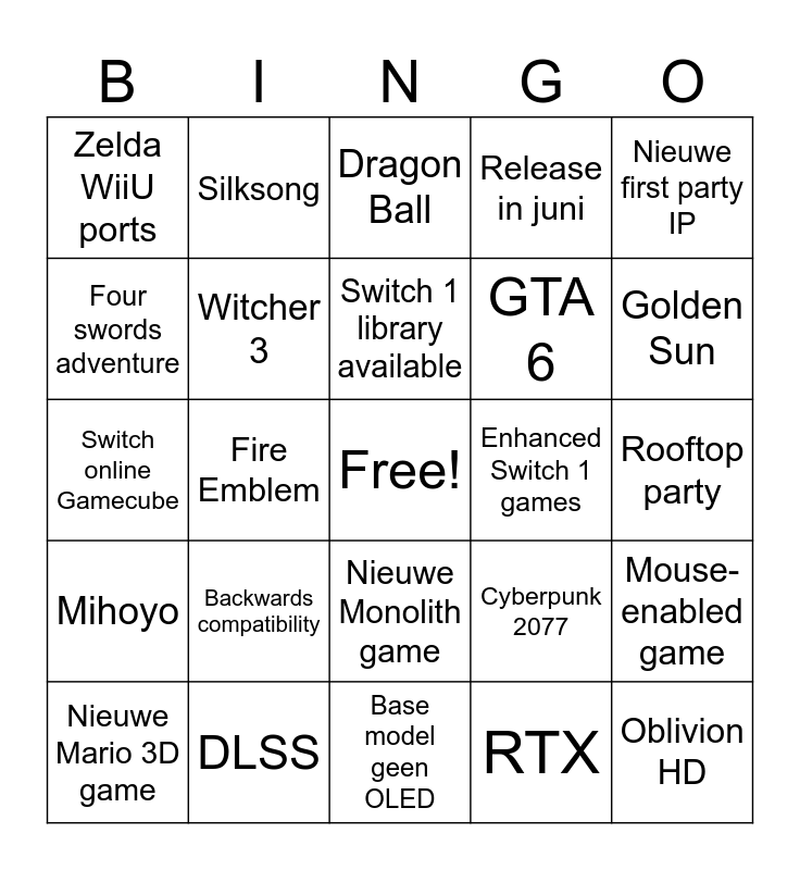 This bingo card has a free space and 24 words: Backwards compatibility, DLSS, Switch 1 library available, Nieuwe Mario 3D game, Nieuwe first party IP, Zelda WiiU ports, Four swords adventure, Silksong, Enhanced Switch 1 games, Nieuwe Monolith game, GTA 6, Switch online Gamecube, Cyberpunk 2077, Mouse-enabled game, Witcher 3, RTX, Rooftop party, Dragon Ball, Golden Sun, Fire Emblem, Oblivion HD, Mihoyo, Release in juni and Base model geen OLED.