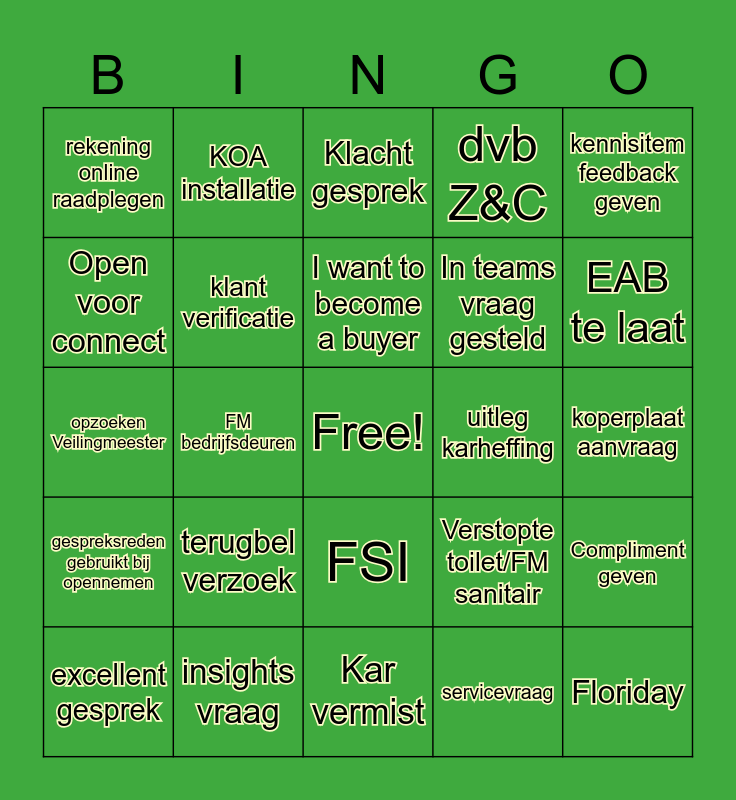 This bingo card has a free space and 47 words: bezoek de veiling, Floriday, Slappe stelen, Kar vermist, terugbel verzoek, Briefnummer?, KOA installatie, koffie/thee halen, Open voor connect, DVB beveiliging, klant verificatie, dvb Z&C, Compliment geven, Verstopte toilet/FM sanitair, samenvatten, inlogproblemen, I want to become a buyer, uitleg karheffing, empathie getoond, kennisitem feedback geven, FM bedrijfsdeuren, servicevraag, rekening online raadplegen, In teams vraag gesteld, BVO, EAB te laat, excellent gesprek, Doorvragen, FSI, gespreksreden gebruikt bij opennemen, klantverificatie, traffic "lukt het?", senior agent om hulp gevraagd, acquisitie, mail wachtrij tussendoor verwerkt, insights vraag, koperplaat aanvraag, dvb Z&C, FM bedrijfsdeur, Wijzigen e-mail adres, melding afsluiten, Klacht gesprek, opzoeken Veilingmeester, Melding direct opgelost, Popje, product afrekening opzoeken and Open voor connect.