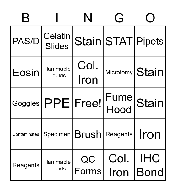 This bingo card has a free space and 49 words: Saftey Data Sheet, Punch, QC Forms, Col. Iron, Stain, Elastic, Gelatin Slides, Shave, Microtomy, GRAM, Eosin, PPE, Reagents, IHC Bond, Lab Coat, PRAME, Stain, Fume Hood, Special Stains, PAS/D, Flammable Liquids, QC Forms, STAT, Pipets, Elastic, Specimen, Col. Iron, Prame, Iron, Contaminated, Forcepts, Brush, Quality Control, Pas/D, Reagents, DUAL, Gelatin Slides, GRAM, Stain, STAT, Alarm, Lab Coat, Gloves, Mask, Goggles, Flammable Liquids, QC Forms, Stain Report and Xylene.