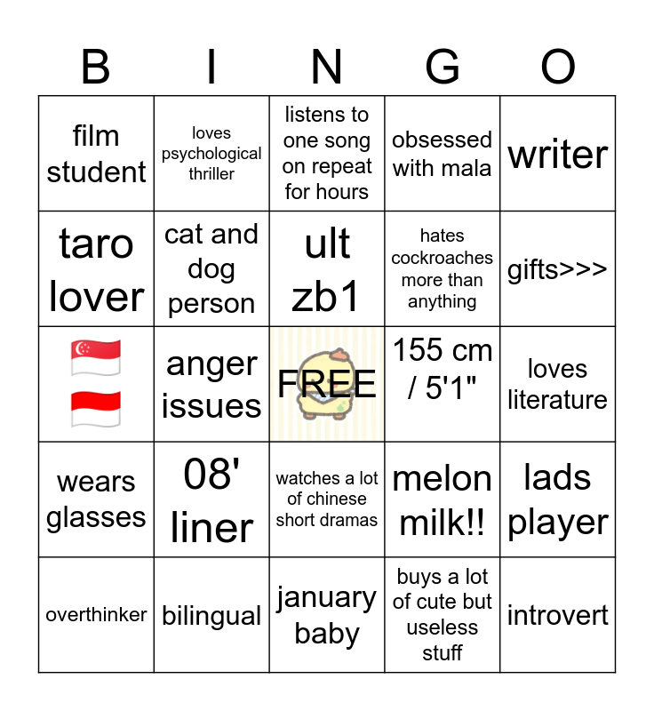 This bingo card has a free space and 24 words: 08' liner, bilingual, ult zb1, overthinker, writer, film student, taro lover, loves psychological thriller, 155 cm / 5'1", watches a lot of chinese short dramas, hates cockroaches more than anything, 🇸🇬🇮🇩, melon milk!!, lads player, cat and dog person, buys a lot of cute but useless stuff, loves literature, listens to one song on repeat for hours, gifts>>>, anger issues, introvert, wears glasses, obsessed with mala and january baby.