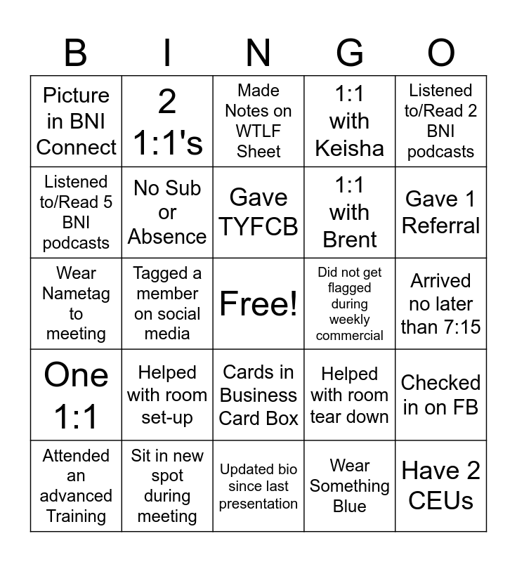 This bingo card has a free space and 24 words: Helped with room set-up, Sit in new spot during meeting, Gave TYFCB, Attended an advanced Training, Listened to/Read 2 BNI podcasts, Picture in BNI Connect, Listened to/Read 5 BNI podcasts, 2 1:1's, Did not get flagged during weekly commercial, Cards in Business Card Box, 1:1 with Brent, Wear Nametag to meeting, Helped with room tear down, Checked in on FB, No Sub or Absence, Wear Something Blue, Arrived no later than 7:15, Made Notes on WTLF Sheet, Gave 1 Referral, Tagged a member on social media, Have 2 CEUs, One 1:1, 1:1 with Keisha and Updated bio since last presentation.
