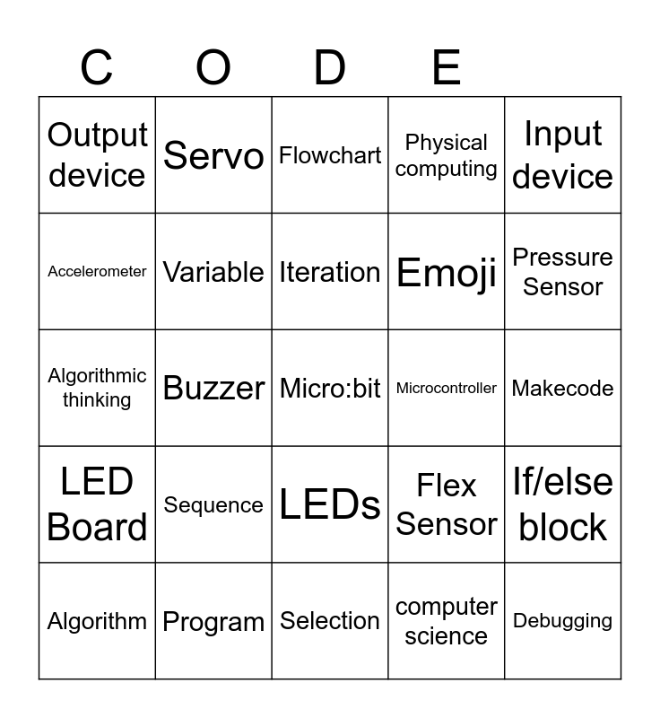 This bingo card has 25 words: Sequence, Selection, Iteration, Algorithm, Input device, Output device, Accelerometer, Servo, Microcontroller, LEDs, Emoji, Algorithmic thinking, Flex Sensor, If/else block, Variable, Debugging, Makecode, Flowchart, Pressure Sensor, Buzzer, Micro:bit, Program, LED Board, Physical computing and computer science.