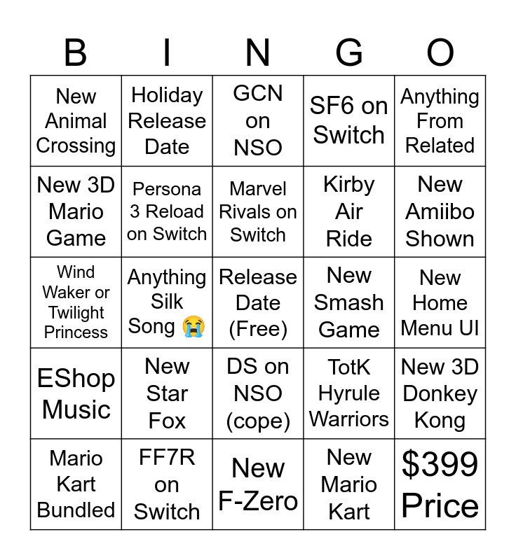This bingo card has a free space and 24 words: New Star Fox, FF7R on Switch, Marvel Rivals on Switch, Mario Kart Bundled, Anything From Related, New Animal Crossing, New 3D Mario Game, Holiday Release Date, New Smash Game, DS on NSO (cope), Kirby Air Ride, Wind Waker or Twilight Princess, TotK Hyrule Warriors, New 3D Donkey Kong, Persona 3 Reload on Switch, New Mario Kart, New Home Menu UI, GCN on NSO, New Amiibo Shown, Anything Silk Song 😭, $399 Price, EShop Music, SF6 on Switch and New F-Zero.