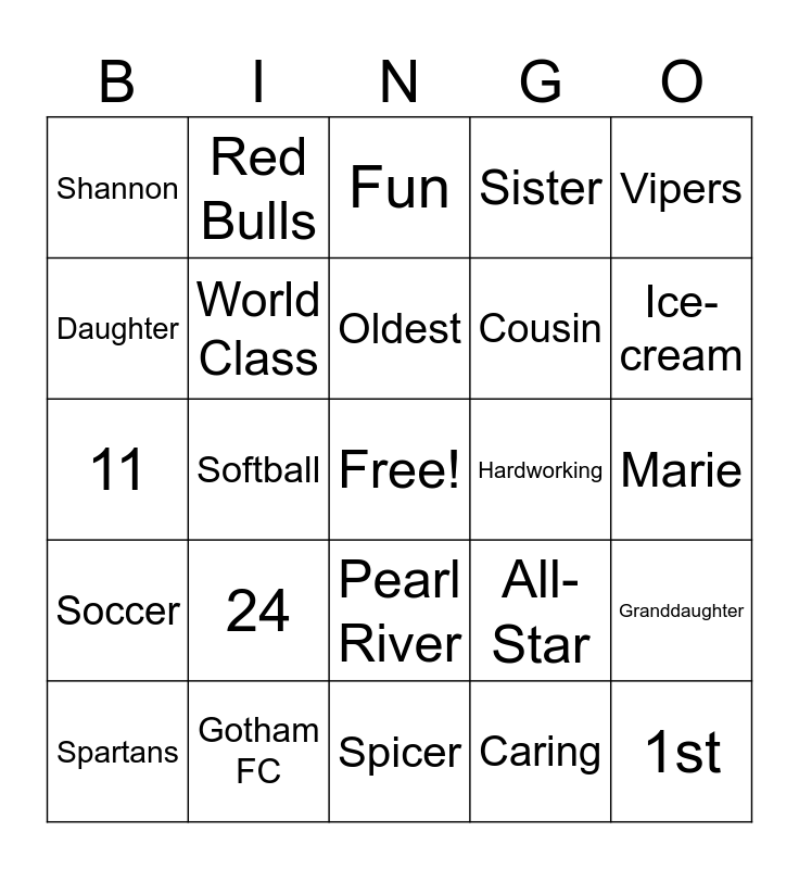 This bingo card has a free space and 33 words: April 7th, 2014, Softball, Basketball, Soccer, World Class, Vipers, Spartans, Red Bulls, Yankees, Oldest, Fun, Smart, Athletic, Hardworking, Ice-cream, Gotham FC, 11, 24, All-Star, Pearl River, St. Margaret's, Shannon, Marie, Spicer, 1st, Sister, Cousin, Daughter, Granddaughter, Catholic, Caring and Kind.