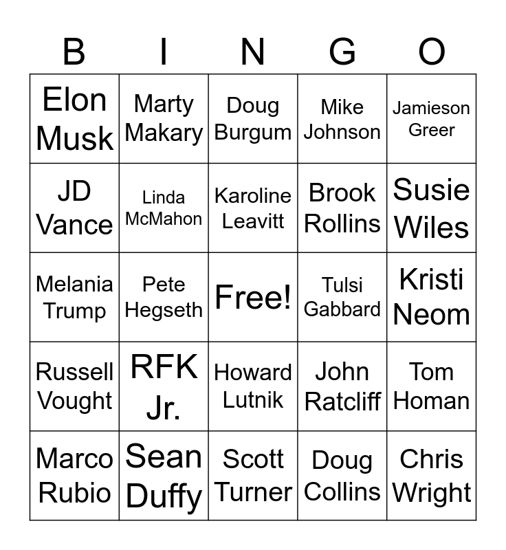 This bingo card has a free space and 29 words: Marco Rubio, Scott Bessent, Pete Hegseth, Pam Bondi, Elon Musk, Doug Burgum, Linda McMahon, RFK Jr., Tulsi Gabbard, Sean Duffy, Kristi Neom, Chris Wright, Scott Turner, Doug Collins, Susie Wiles, Lori Chavez, Howard Lutnik, Russell Vought, Jamieson Greer, Melania Trump, John Ratcliff, Kelly Loeffler, Brook Rollins, JD Vance, Mike Johnson, Marty Makary, Tom Homan, Karoline Leavitt and Kash Patel.