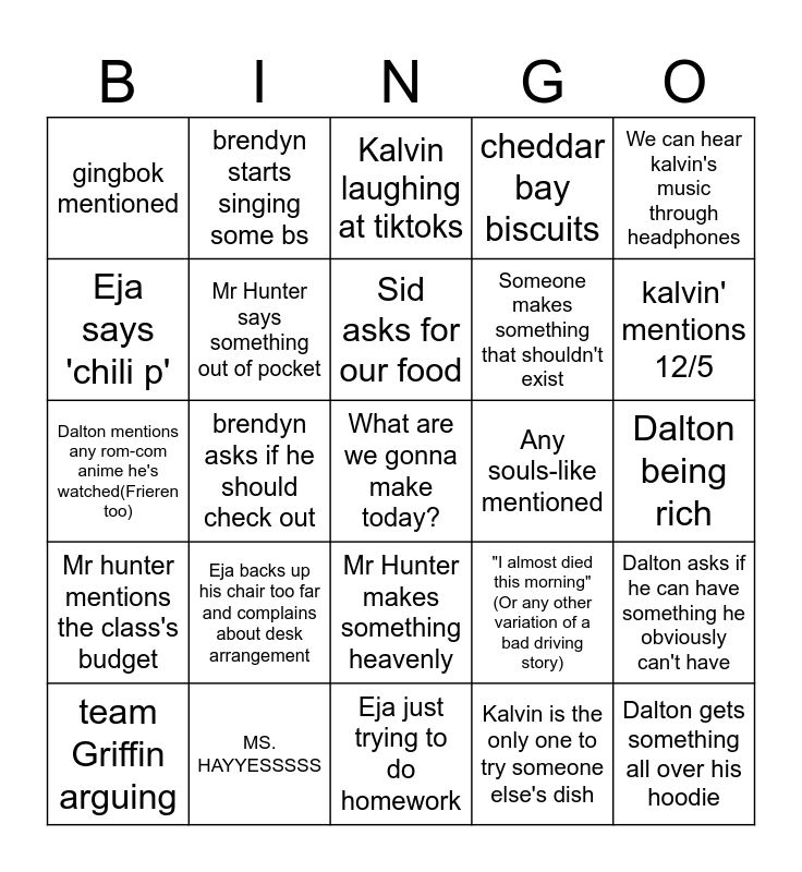 This bingo card has a free space and 74 words: Kalvin' crashing out on siege, invincible reference, Kalvin laughing at tiktoks, Dalton forgets/ adds too much of something, Mr hunter crashing out on sid, We forget to add an ingredient, kalvin' brings up some dumb comparison, Eja getting groped, team Griffin arguing, Mr hunter says smth relatable, operation pyrite sung by brendyn or dalton, the paprika incident is brought up, Sid asks for our food, Eja says 'chili p', Dalton mentions an artist NO ONE knows, brendyn asks if he should check out, 'oops', kalvin' mentions 12/5, we hear an egregiously outrageous conversation, Dalton mentions any rom-com anime he's watched(Frieren too), Mr Hunter says something out of pocket, brendyn starts singing some bs, cheddar bay biscuits, 'bad dragon', Dalton gets something all over his hoodie, "we're giving this to Owen" and it's literally a love letter, the god-awful snickerdoodle cookies mentioned, shadow slave mentioned/spoiled, brendyn mentions new 'peak' light novel, kalvin' scrolls on tinder, We can hear kalvin's music through headphones, finding out we don't have an ingredient midway through the recipe, Too much of any extract, "let's add a little bit of this" and it's every spice, brendyn slaving away on dishes, Kalvin is the only one to try someone else's dish, kalvin / eja eating unfinished product, Mr hunter calls out sid for not doing dishes, dalton hating any "good" show, Meredith doesn't like an absolutely scrumptious dish, Eja just trying to do homework, MS. HAYYESSSSS, Kalvin says something diabolically racist, Dalton adding an excessive amount of one ingredient, Eja makes a slideshow, gingbok mentioned, something gets burnt/overcooked, Eja backs up his chair too far and complains about desk arrangement, We are somehow the best cooks in the class, Kalvin makes fried rice, Gooning/Booning is mentioned, Owen visit, Dalton being rich, Dalton "being" poor, "You look like _", Mr Hunter says "try this", Mr Hunter makes something heavenly, Entire group clowns Eja for something relatively normal, "What's for lunch today?", Dalton asks if he can have something he obviously can't have, Someone makes something that shouldn't exist, Eja fat joke, Mr hunter mentions the class's budget, REF DO SOMETHING, Any souls-like mentioned, brendyn is gone/leaves for no real reason, dalton mogs out of nowhere, dalton steals brendyn's gum or eats icebreaker, "I almost died this morning"(Or any other variation of a bad driving story), Owen or eja absent with lab mentioned, brendyn is injured in any way, IT blocks the most random website/search, Sid absolutely ruins a recipe and Knitter mentioned.