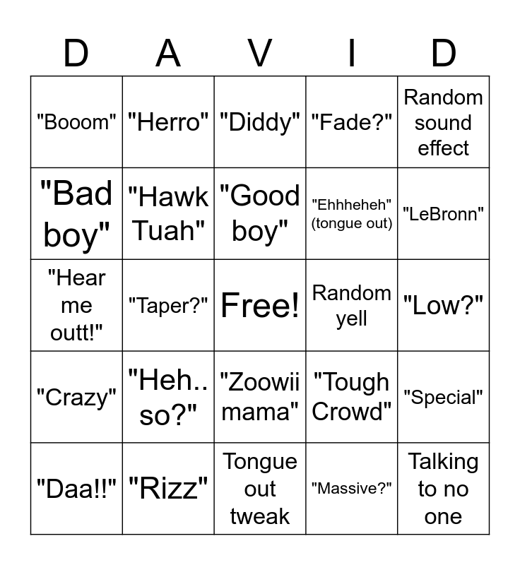 This bingo card has a free space and 24 words: "Heh.. so?", "Rizz", "Good boy", "Daa!!", Random sound effect, "Booom", "Bad boy", "Herro", Random yell, "Zoowii mama", "Ehhheheh" (tongue out), "Hear me outt!", "Tough Crowd", "Special", "Hawk Tuah", "Massive?", "Low?", "Diddy", "LeBronn", "Taper?", Talking to no one, "Crazy", "Fade?" and Tongue out tweak.