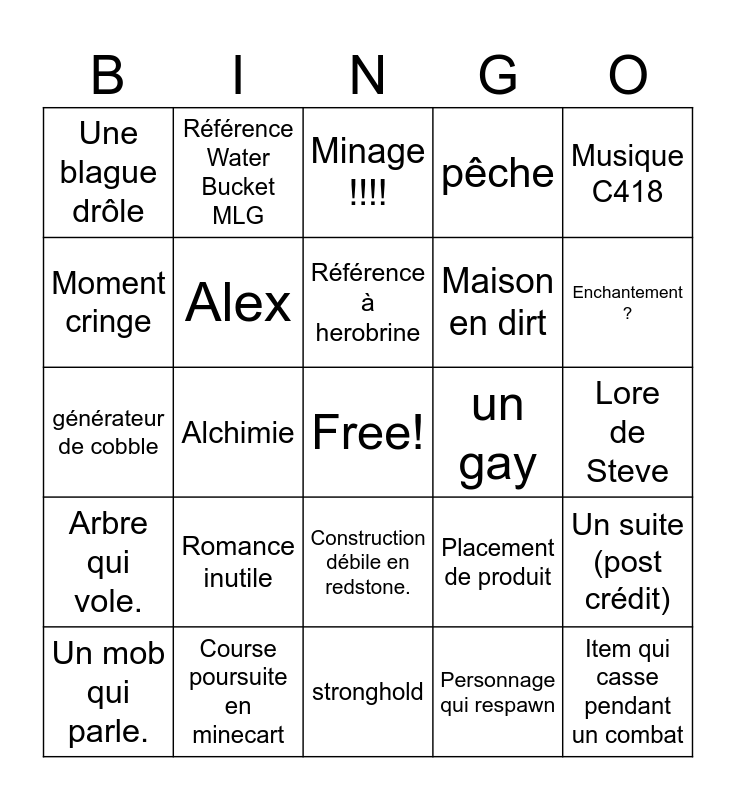 This bingo card has a free space and 24 words: Romance inutile, Course poursuite en minecart, Référence à herobrine, Un mob qui parle., Musique C418, Une blague drôle, Moment cringe, Référence Water Bucket MLG, un gay, Construction débile en redstone., Maison en dirt, générateur de cobble, Placement de produit, Un suite (post crédit), Alex, Personnage qui respawn, Lore de Steve, Minage !!!!, Enchantement ?, Alchimie, Item qui casse pendant un combat, Arbre qui vole., pêche and stronghold.