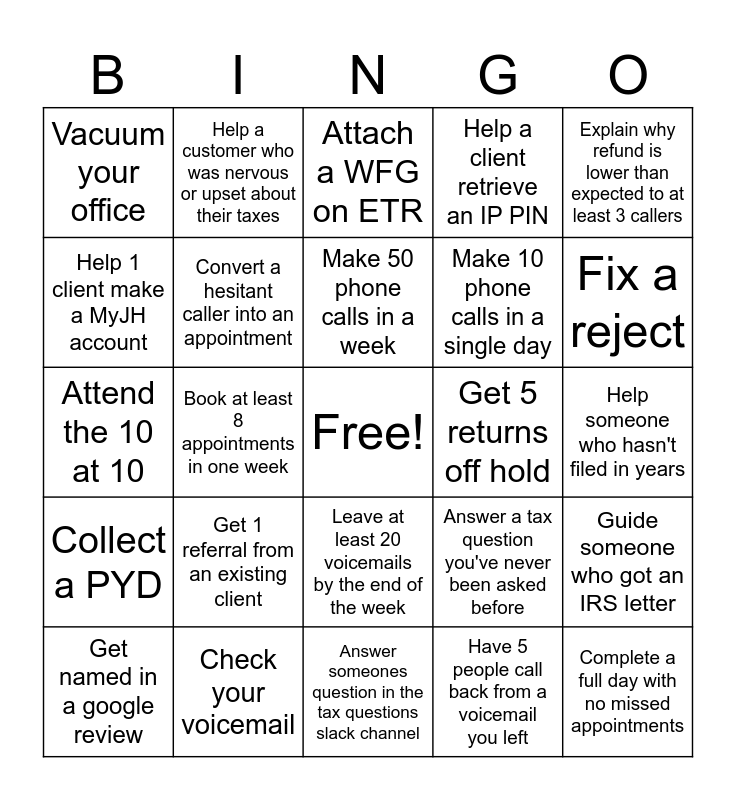 This bingo card has a free space and 24 words: Get 1 referral from an existing client, Check your voicemail, Make 50 phone calls in a week, Get named in a google review, Explain why refund is lower than expected to at least 3 callers, Vacuum your office, Help 1 client make a MyJH account, Help a customer who was nervous or upset about their taxes, Get 5 returns off hold, Leave at least 20 voicemails by the end of the week, Make 10 phone calls in a single day, Attend the 10 at 10, Answer a tax question you've never been asked before, Guide someone who got an IRS letter, Convert a hesitant caller into an appointment, Have 5 people call back from a voicemail you left, Help someone who hasn't filed in years, Attach a WFG on ETR, Fix a reject, Book at least 8 appointments in one week, Complete a full day with no missed appointments, Collect a PYD, Help a client retrieve an IP PIN and Answer someones question in the tax questions slack channel.
