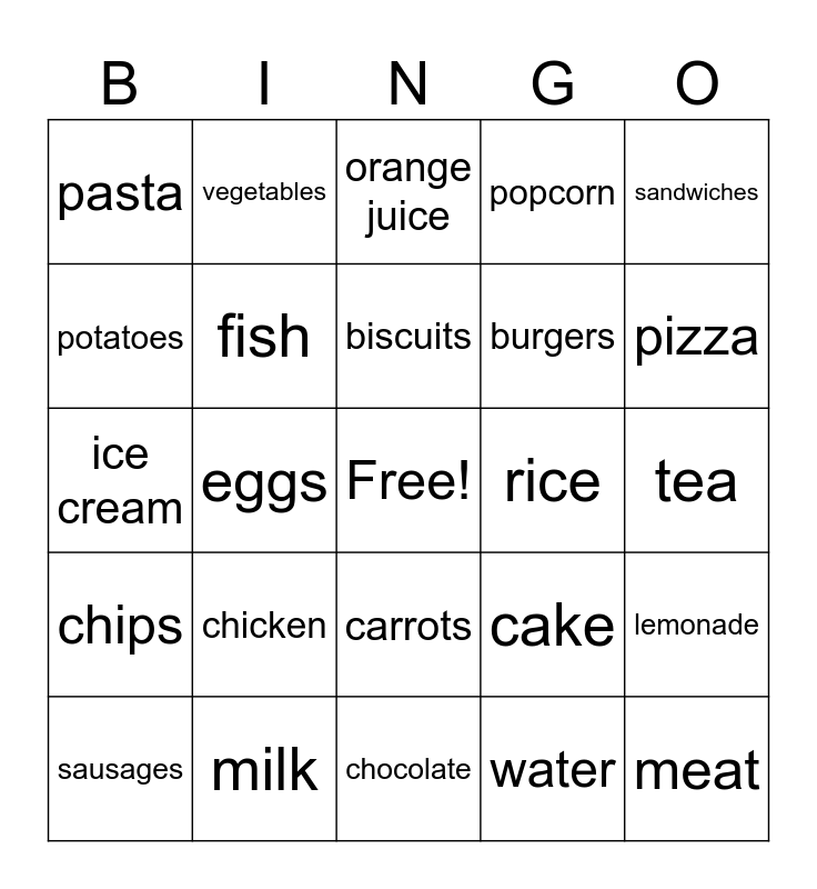 This bingo card has a free space and 24 words: chicken, milk, biscuits, sausages, sandwiches, pasta, potatoes, vegetables, rice, carrots, burgers, ice cream, cake, lemonade, fish, water, tea, orange juice, pizza, eggs, meat, chips, popcorn and chocolate.