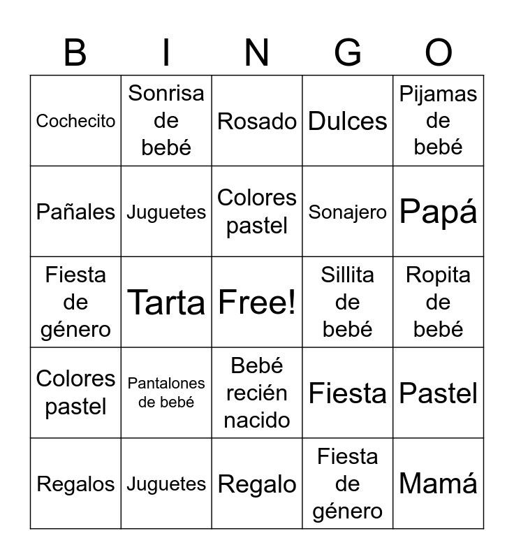 This bingo card has a free space and 52 words: Biberón, Mamá, Papá, Regalo, Pantalones de bebé, Dulces, Sonrisa de bebé, Maternidad, Pañales, Rojo (si es el color del baby shower), Juguetes, Primeras palabras, Pastel, Fiesta, Canción de cuna, Ropita de bebé, Colores pastel, Sillita de bebé, Bebé recién nacido, Pijamas de bebé, Tarta, Fiesta de género, Cochecito, Sonajero, Regalos, Fiesta, Biberón, Mamá, Papá, Regalo, Pantalones de bebé, Dulces, Sonrisa de bebé, Maternidad, Pañales, Rosado, Juguetes, Primeras palabras, Pastel, Fiesta, Canción de cuna, Ropita de bebé, Colores pastel, Sillita de bebé, Bebé recién nacido, Pijamas de bebé, Tarta, Fiesta de género, Cochecito, Sonajero, Regalos and Fiesta.