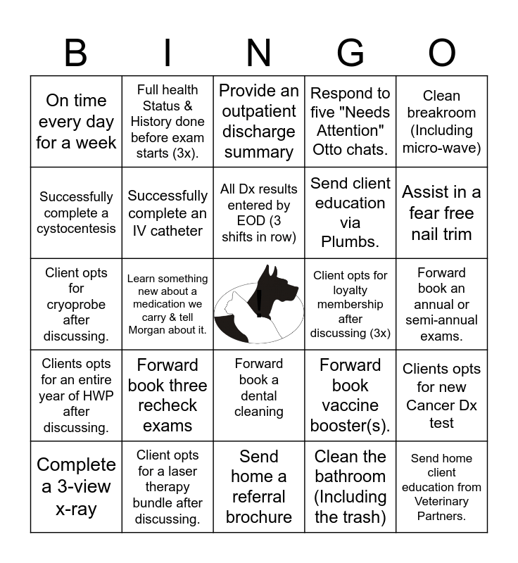 This bingo card has a free space and 24 words: Forward book three recheck exams, Client opts for a laser therapy bundle after discussing., All Dx results entered by EOD (3 shifts in row), Complete a 3-view x-ray, Clean breakroom (Including micro-wave), On time every day for a week, Successfully complete a cystocentesis, Full health Status & History done before exam starts (3x)., Client opts for loyalty membership after discussing (3x), Forward book a dental cleaning, Send client education via Plumbs., Client opts for cryoprobe after discussing., Forward book vaccine booster(s)., Clients opts for new Cancer Dx test, Successfully complete an IV catheter, Clean the bathroom (Including the trash), Forward book an annual or semi-annual exams., Provide an outpatient discharge summary, Assist in a fear free nail trim, Learn something new about a medication we carry & tell Morgan about it., Send home client education from Veterinary Partners., Clients opts for an entire year of HWP after discussing., Respond to five "Needs Attention" Otto chats. and Send home a referral brochure.