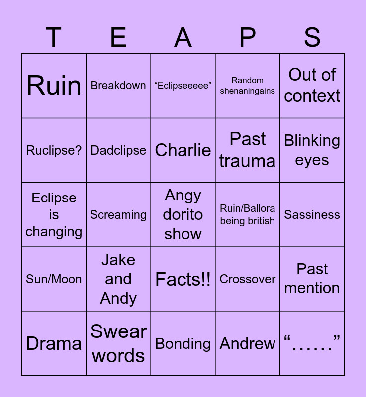 This bingo card has a free space and 30 words: Swear words, Frank, Screaming, Magic, Ruin, “Eclipseeeee”, Dadclipse, Facts!!, Ruin/Ballora being british, Bonding, Sassiness, “……”, Andrew, Someone loosing their mind, Blinking eyes, Og Puppet, Crossover, Sun/Moon, Jake and Andy, Out of context, Eclipse is changing, Rage, Breakdown, Past trauma, Ruclipse?, Random shenaningains, Past mention, Drama, Charlie and Roxy.