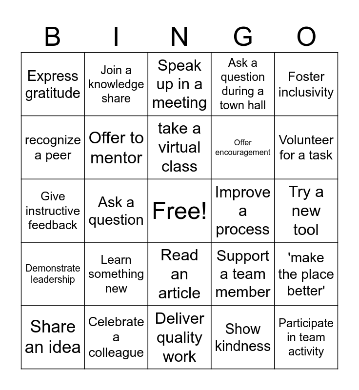 This bingo card has a free space and 29 words: Share an idea, Help a colleague, Ask a question, Complete a task early, Express gratitude, Speak up in a meeting, Offer to mentor, Learn something new, Improve a process, Celebrate a colleague, Try a new tool, Participate in team activity, Deliver quality work, Show kindness, Volunteer for a task, Share resources, Read an article, Demonstrate leadership, Foster inclusivity, Give instructive feedback, Support a team member, Set a personal goal, Offer encouragement, recognize a peer, Ask a question during a town hall, Join a knowledge share, 'make the place better', take a virtual class and get to know a peer.