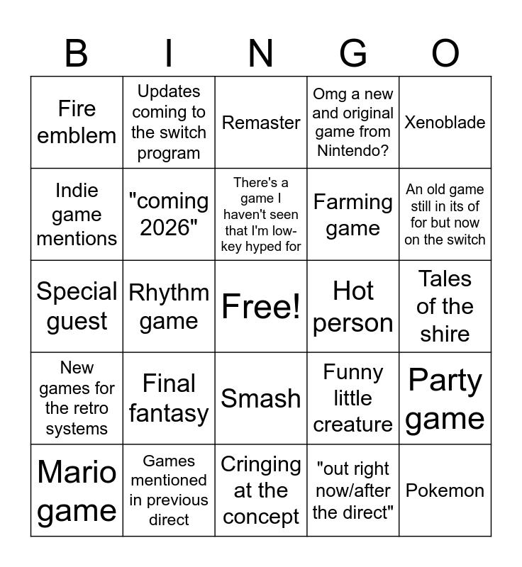 This bingo card has a free space and 24 words: Final fantasy, Games mentioned in previous direct, There's a game I haven't seen that I'm low-key hyped for, Mario game, Xenoblade, Fire emblem, Indie game mentions, Updates coming to the switch program, Hot person, Smash, Farming game, Special guest, Funny little creature, Party game, "coming 2026", "out right now/after the direct", Tales of the shire, Remaster, An old game still in its of for but now on the switch, Rhythm game, Pokemon, New games for the retro systems, Omg a new and original game from Nintendo? and Cringing at the concept.