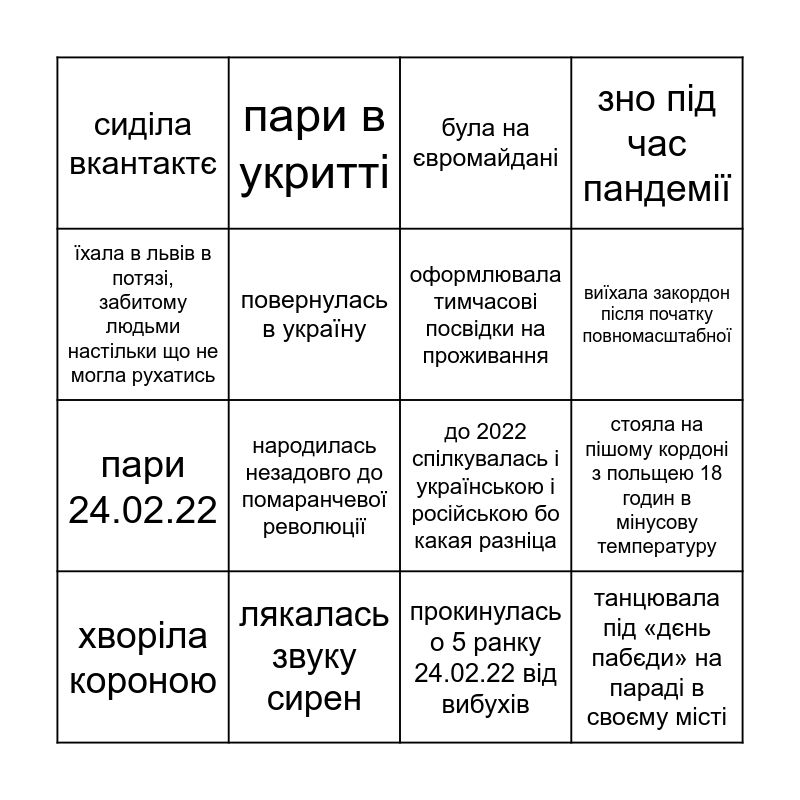 This bingo card has 18 words: народилась незадовго до помаранчевої революції, танцювала під «дєнь пабєди» на параді в своєму місті, була на євромайдані, сиділа вкантактє, до 2022 спілкувалась і українською і російською бо какая разніца, зно під час пандемії, хворіла короною, пари в укритті, виїхала закордон після початку повномасштабної, пари 24.02.22, прокинулась о 5 ранку 24.02.22 від вибухів, їхала в львів в потязі, забитому людьми настільки що не могла рухатись, стояла на пішому кордоні з польщею 18 годин в мінусову температуру, повернулась в україну, оформлювала тимчасові посвідки на проживання, стосунки на відстані, лякалась звуку сирен and видалила всю російську музику і відписалась від росіян.