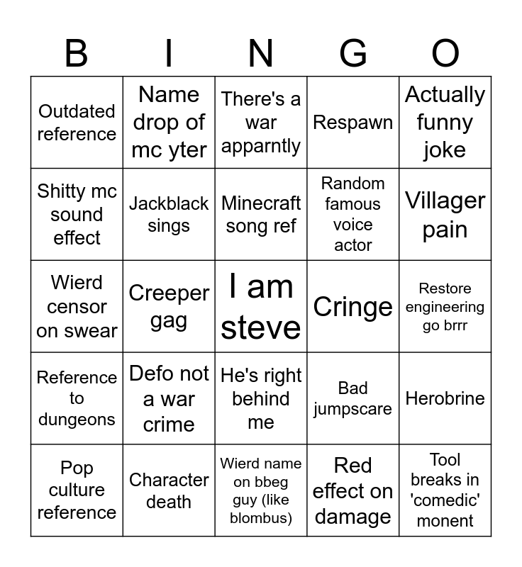This bingo card has a free space and 24 words: Defo not a war crime, Character death, Minecraft song ref, Pop culture reference, Actually funny joke, Outdated reference, Shitty mc sound effect, Name drop of mc yter, Cringe, He's right behind me, Random famous voice actor, Wierd censor on swear, Bad jumpscare, Herobrine, Jackblack sings, Red effect on damage, Restore engineering go brrr, There's a war apparntly, Villager pain, Creeper gag, Tool breaks in 'comedic' monent, Reference to dungeons, Respawn and Wierd name on bbeg guy (like blombus).