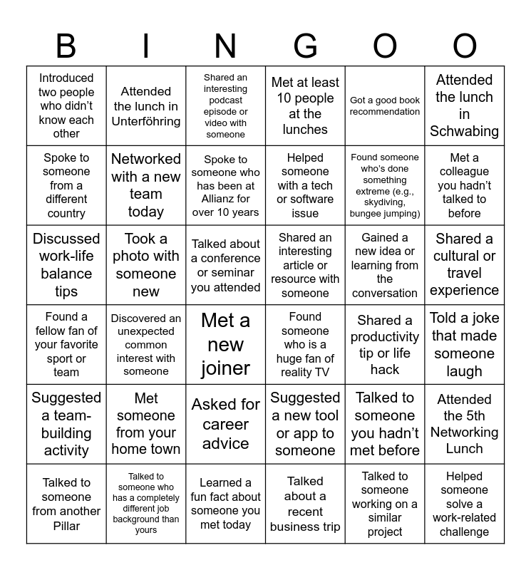This bingo card has 38 words: Attended the 5th Networking Lunch, Talked to someone you hadn’t met before, Helped someone solve a work-related challenge, Spoke to someone from a different country, Discovered an unexpected common interest with someone, Gained a new idea or learning from the conversation, Networked with a new team today, Talked to someone working on a similar project, Got a good book recommendation, Spoke to someone who has been at Allianz for over 10 years, Met a colleague you hadn’t talked to before, Met at least 10 people at the lunches, Discussed work-life balance tips, Talked about a conference or seminar you attended, Attended the lunch in Schwabing, Shared an interesting article or resource with someone, Asked for career advice, Shared an interesting podcast episode or video with someone, Talked to someone who has a completely different job background than yours, Took a photo with someone new, Introduced two people who didn’t know each other, Found someone who is a huge fan of reality TV, Helped someone with a tech or software issue, Met a new joiner, Learned a fun fact about someone you met today, Shared a productivity tip or life hack, Suggested a team-building activity, Talked about a recent business trip, Talked to someone from another Pillar, Suggested a new tool or app to someone, Met someone with the same hobby, Shared a cultural or travel experience, Told a joke that made someone laugh, Attended the lunch in Unterföhring, Met someone from your home town, Found a fellow fan of your favorite sport or team, Found someone who’s done something extreme (e.g., skydiving, bungee jumping) and Laughed about a bad date story.