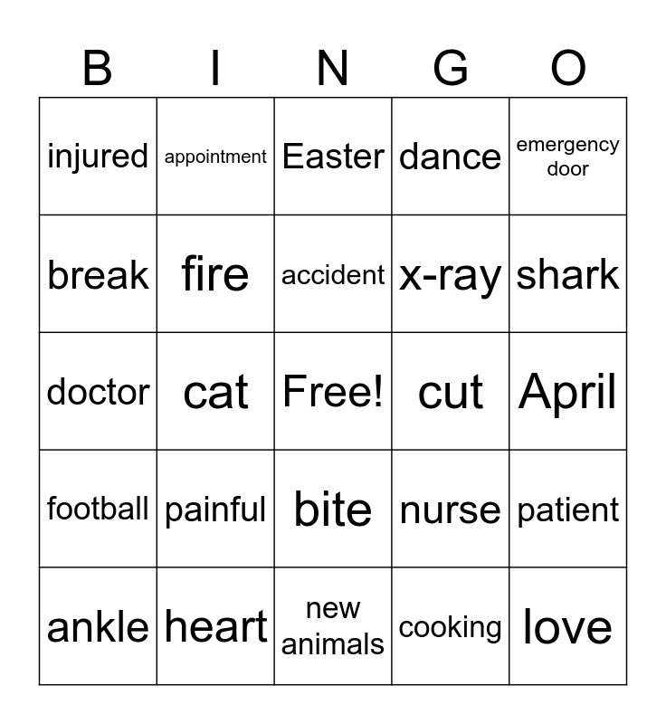 This bingo card has a free space and 24 words: painful, heart, accident, ankle, emergency door, injured, break, appointment, cut, bite, x-ray, doctor, nurse, patient, fire, cooking, April, Easter, shark, cat, love, football, dance and new animals.